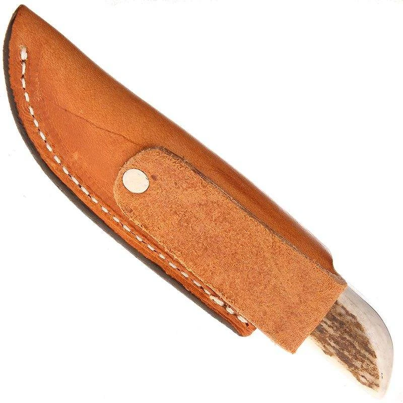 The small knife measures a total of 5 1/4″ with 2.5″ blade and 2.5″ elk handle. Comes with a leather sheath.
