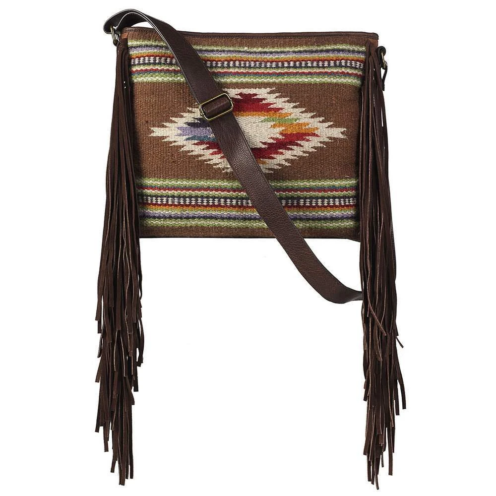 Ariat Sheridan messenger bag by M&F Western Products. Brown leather straps with a God’s eye southwestern design on handwoven fabric and suede fringe on the sides. Gun pocket on back with left and right hand access. Top zip closure to keep your belongings safe.