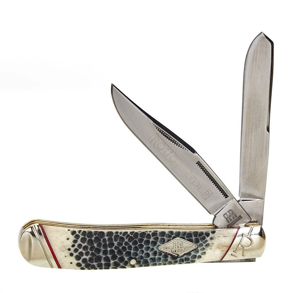 Many uses for this multi purpose tool. This trapper folding pocket knife with buckshot bone handle is 4.13 inches when closed. The clip and spey blades are a stainless steel mirror finsih. The bone handle also has inlay shield and bolster(s). Made in China. Model: RR1544