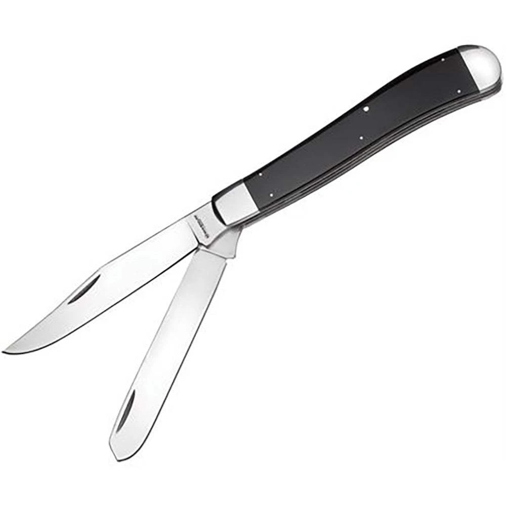 The Majestic draws attention with its huge, imposing presence. The two 440 stainless steel blades have a fine edge finish and are fully functional. The black synthetic polymer handle scales are topped off with stainless steel bolsters, and the back spring is embellished with decorative file work. It maynot be your everyday go-to knife, but it will certainly add refreshing variety to your collection. 01LL2076