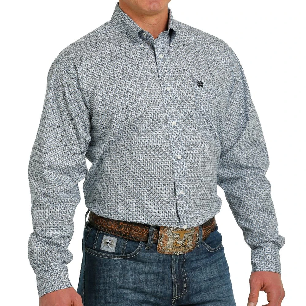 You can’t go wrong wearing a classic print cotton plain weave like this blue colored option crafted by CINCH. A reliable wardrobe staple, this shirt features an open left front pocket, embroidered logo and white buttons.