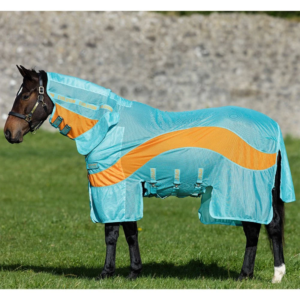 The Evolution Fly Sheet utilizes an innovative and super light disc front closure with the latest in insect technology. Insects respond differently to different colors, most cannot perceive orange or aqua, because their vision centers on different sections of the electromagnetic spectrum, making these colors natural deterrents. The Evolution sheet incorporates these colors with the breathable, lightweight knitted polyester net fabric which is soft, absorbent, and has sun reflecting properties that offer UV protection.