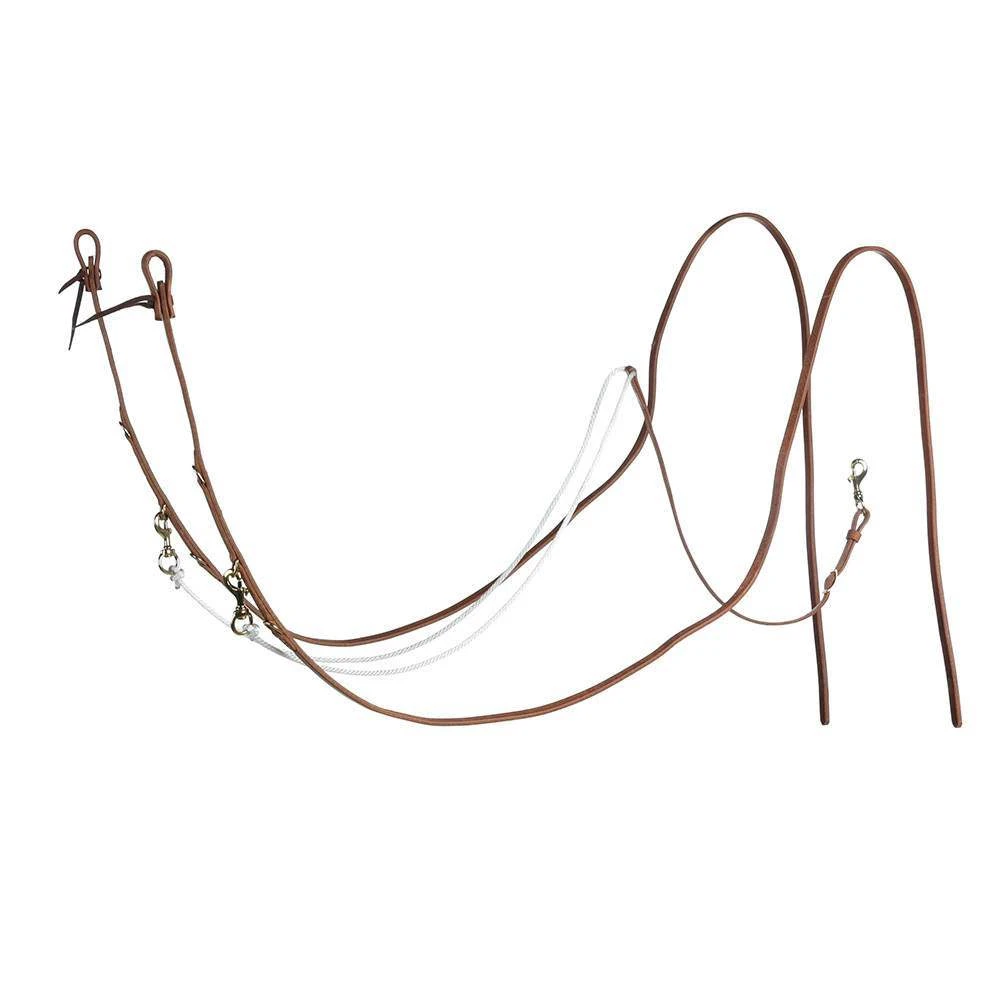 This NRS Tack Harness Leather German Martingale is the ideal training tool for performance horses. Built with heavy-duty non-oiled Hermann Oak harness leather that will last for years of training. Includes split reins that have a great feel and weighted ends. There are no rings on the fork portion of the martingale to slide down the reins and get caught on the bit. Tip: The cord portion runs through the bit rings and snaps to one of the 3 dees on the reins. Provides a fixed length, easy adjustment and an endpoint for the pull of the martingale which helps prevent overflexion.Â