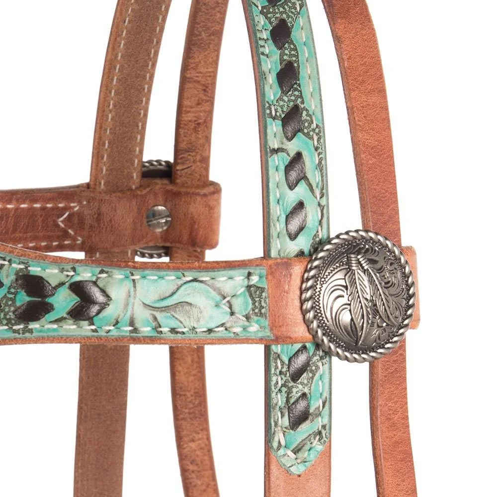 A unique turquoise rose browband headstall that is made for NRS by San Saba Equine. The old silver feather conchos emphasize the uniqueness of this headstall. Made out of harness leather for quality and durability.