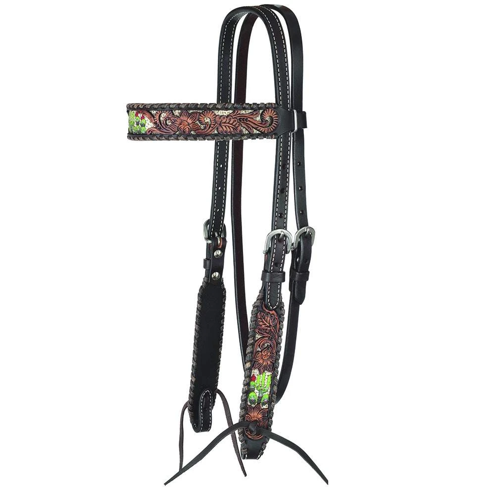 Spice up your tack with this Circle Y Cactus Country Browband Headstall! Made with impressive craftsmanship, this high quality leather headstall features hand stamped and tooled detailing throughout. Green and red painted cactus designs on the browband and cheek pieces add a touch of flair while staying true to the western style. Great choice for anyone from barrel racers to trail riders.