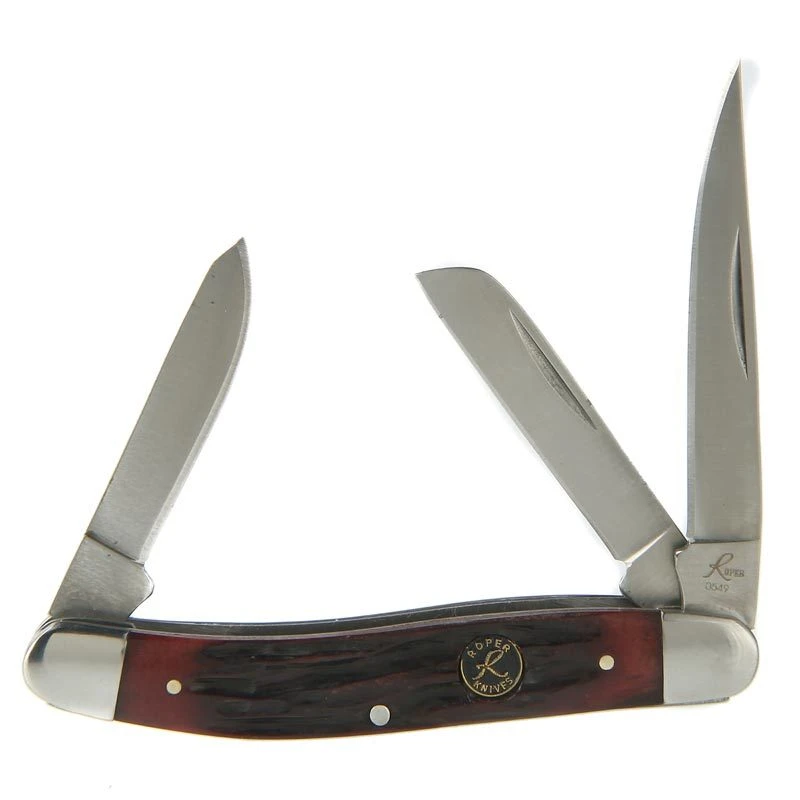 The Roper Knives Brown Bone Stockman Knife features a beautiful brown jigged bone handle and measures 3 1/2″ closed.