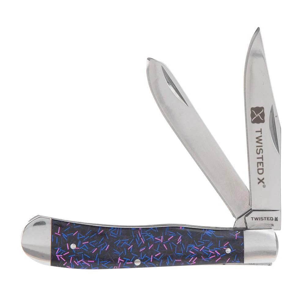 This Western Fashion Accessories knife is etched on one blade with Twisted X and packaged in a Twisted X box. The trapper is a great pocket knife for everyday carry displaying a fireworks color of purple and blue with two nicely balanced bolsters. Style XK-410